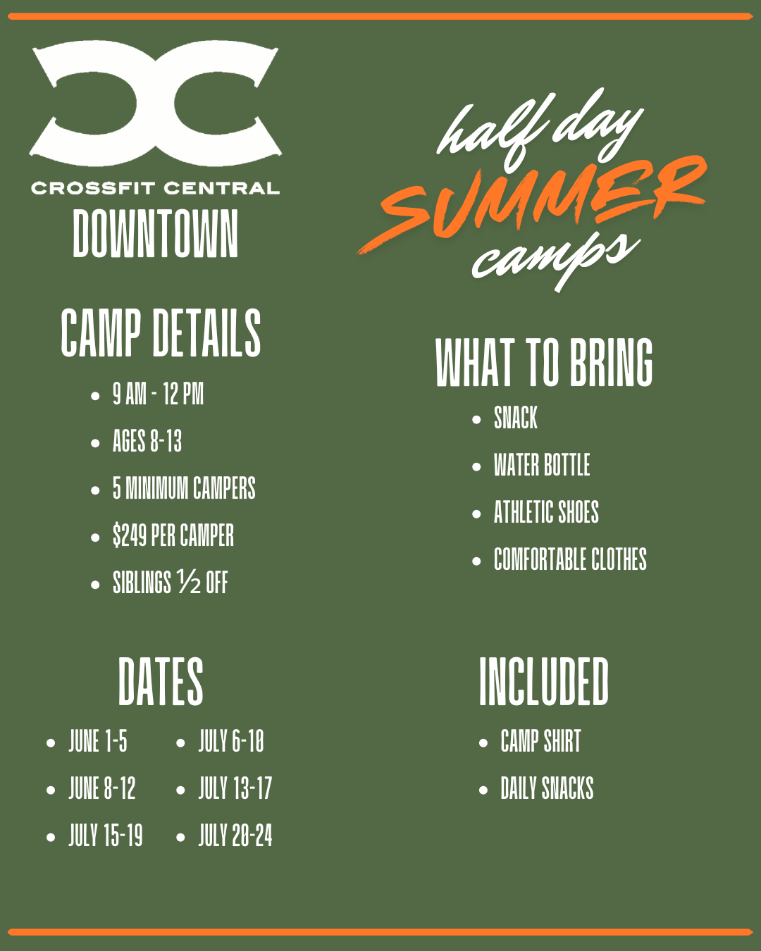 Our camp offers a dynamic blend of workouts, games, and activities tailored specifically for kids, led by experienced coaches who prioritize safety and enjoyment. Through our summer camp your young athlete will learn fundamental movement skills, improve coordination, build confidence, and foster a love for staying active.